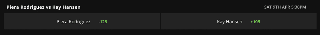 In the top image, Piera Rodriquez is the favorite at -125. However, Kay Hansen is not that far behind at +105. This match really could go either way.