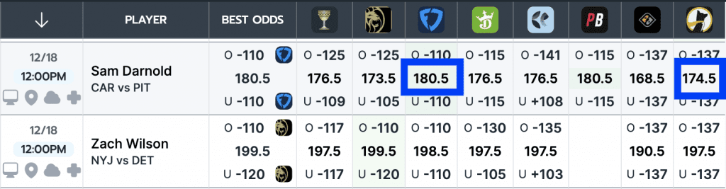 Fourth leg, Sam Darnold over 168.5 passing yards. This line is criminally low 168.5 passing yards. Every other book is higher, and FanDuel is all the way up to 180.5!