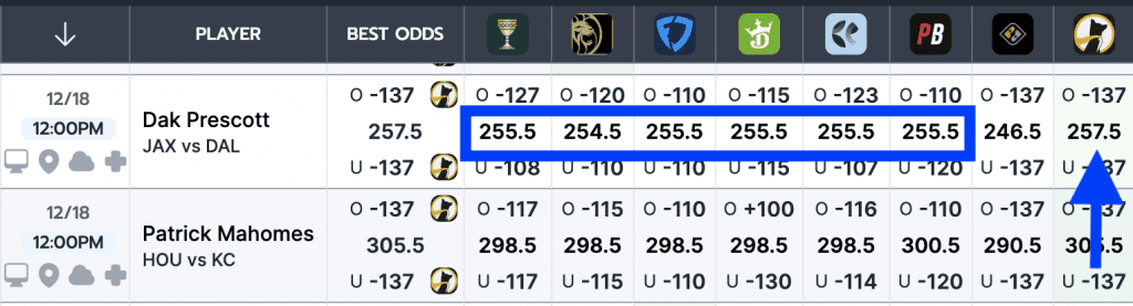 The final leg is Dak Prescott over 246.5 passing yards. Again, if every book is almost 10+ yards above another books line, we can expect for there to be value in the over of that lower line. Hammer that over 246.5!