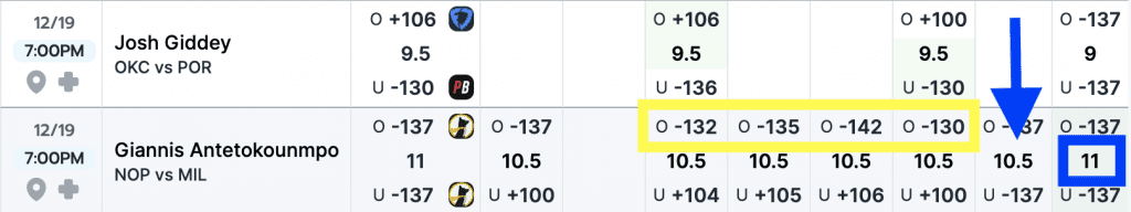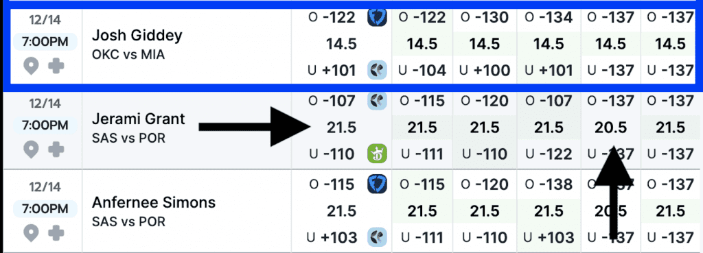 The next leg is Josh Giddey over 14.5 points. Using the OddsJam Screen there wasn’t a line discrepancy, but the odds favor Josh Giddey to go over 14.5 points.