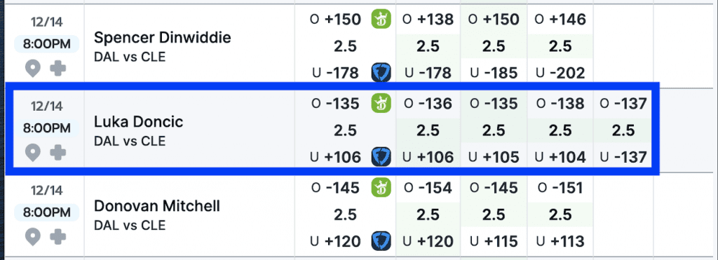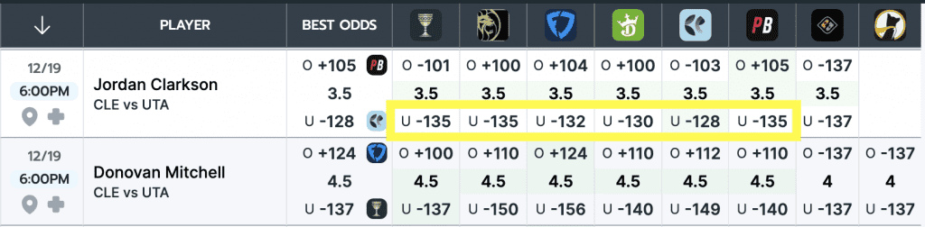 The first leg of the next power play is Jordan Clarkson less than 3.5 assists. No line movement here, but the books are all in agreement Clarkson is most likely to go under 3.5 assists. If you look at the historical stats, too, you’ll see he generally does hit this under.