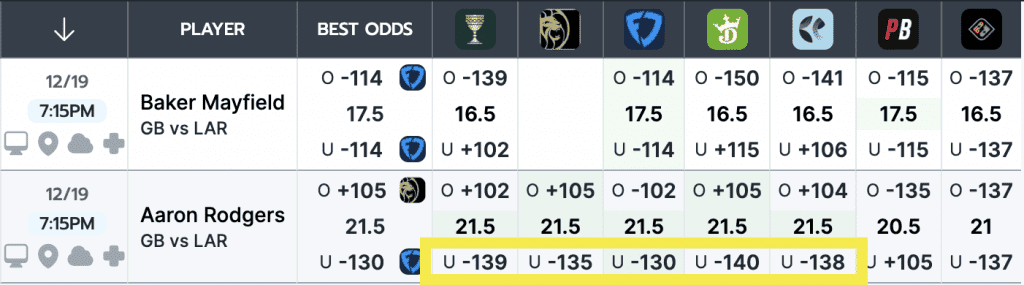Leg one is Aaron Rodgers less than 21 pass completions. The line has moved a half point up at most books, giving them some security in the fact that there can’t be a push. PrizePicks has stayed at 21, but with the trend being that Rodgers is going to pass for 21 or less, if it pushes we get a refund and if it hits we get a payout. I’m willing to roll the dice here.
