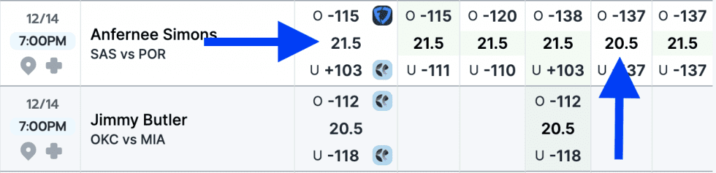 The second leg is Anfernee Simons over 20.5 points. Just like Jerami Grant above, the line is moving but PrizePicks had not.