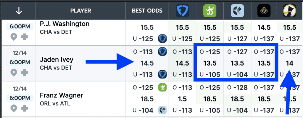 The third leg is Jaden Ivey over 13.5 points. This one is a super-value play! Not only did the UnderDog line move to 14, but FanDuel has moved its line to 14.5.