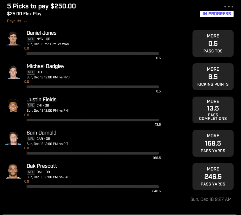 For all you degenerates out there, I’ve got a 5 leg parlay just for you. The first leg of this one is Daniel Jones over 0.5 Pass TDs and this is the discounted play for Picksmas.